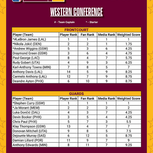 Firstly, the stupid position designations. Both Booker and Paul are backcourt listed, and you couldn’t really begrudge either Stephen Curry or Ja Morant of their All-Star starting berths. Wiggins, however, is listed in the frontcourt, so he’s not competing with them for votes.